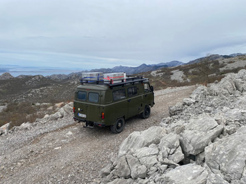 Den zweiten Tag verbrachten wir damit, von Österreich durch das wunderschöne Slowenien nach Kroatien zu fahren. Solche Reisen bringen nunmal auch reine Fahrtage mit sich. Aber trotzdem kann man die wunderschöne Gegend erstaunen. Wir haben als Ziel den Winnetou-Pass in Kroatien angepeilt. Dort wurden viele Winnetou Filme gedreht und man kann die Schotterpisten durch das ganze Gebiet fahren. Dort angekommen, haben wir die campen-verboten Schilder "übersehen" und haben eine wunderbare Nacht auf dem Pass mit Meerblick verbracht. Man muss dazu sagen, wir waren im April dort. In der Hauptsaison würden wir zum übernachten andere Plätze anfahren.