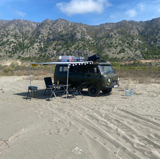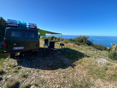 Am Morgen des 5. Tages packten wir unsere Sachen und fuhren weiter. Zunächst bis an die Grenze nach Montenegro, wo sich weniger für uns als unser Auto interessiert wurde. Die weiter Fahrt ging über eine sehr beeindruckende Panoramastraße in Montenegro, immer entlang des Meeres. Dann endlich- die Albanische Grenze. Wir waren zum ersten Mal mit dem Auto im EU-Ausland und entsprechend groß war unsere Aufregung. Nachdem der Grenzbeamte mit breitem Grinsen sagte: "WELCOME TO ALBANIA" fiel uns ein großer Stein vom Herzen. Angekommen in Albanien führte uns eine weitere 2 Stündige fahrt direkt zum Strand, wo wir ungestört die nächsten 2 Tage verbrachten.